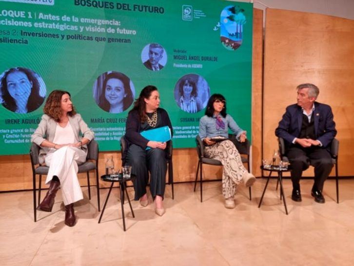 La Mesa 2 “Inversiones y políticas que generan resiliencia” estuvo compuesta por Irene Aguiló, directora general de Biodiversidad y Gestión Forestal de la Comunidad de Madrid, María Cruz Ferreira, secretaria autonómica de Energía, Sostenibilidad y Acción Climática del Gobierno de la Región de Murcia, Susana Jara, directora general de medio natural y biodiversidad de la Junta de Comunidades de Castilla-La Mancha y fue moderada por Miguel Ángel Duralde, presidente de ASEMFO. Afirmaron que la resiliencia requiere planificación estable, inversión continuada y colaboración público-privada y que solo con coherencia política y apoyo al territorio será posible una gestión forestal sostenible y generadora de desarrollo rural.