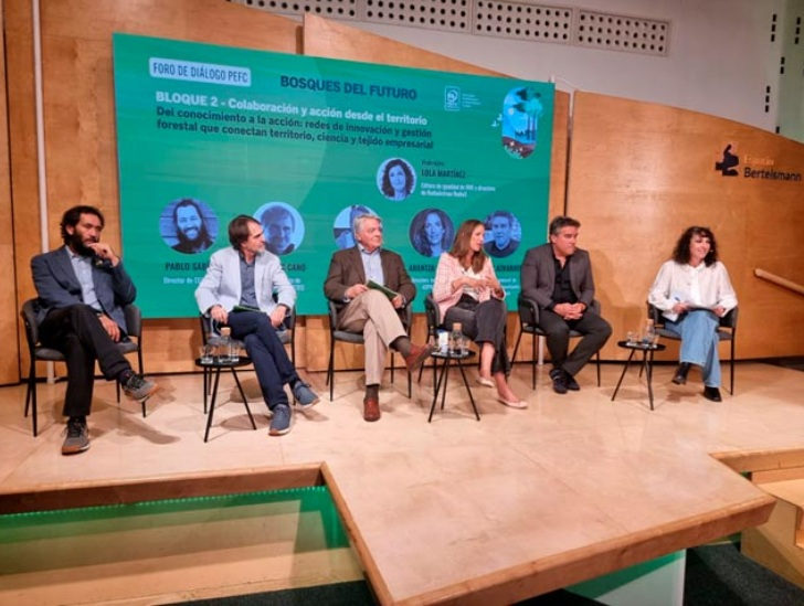 El Bloque 2 “Colaboración y acción desde el territorio. Del conocimiento a la acción: redes de innovación y gestión forestal que conectan territorio, ciencia y tejido empresarial”, contó con la participación de Pablo Sabín, director de CESEFOR, Francesc Cano, director adjunto de transferencia del CTFC, Enrique Valero, presidente de PEFC Galicia y director del grupo de investigación AF-4 de la Universidad de Vigo, Arantza Pérez, directora forestal de ASPAPEL, Oskar Azkarate, director general de Baskegur y representante de PEFC Euskadi, y en el papel de moderadora Lola Martínez, editora de igualdad de RNE y directora del programa RadioActivas .