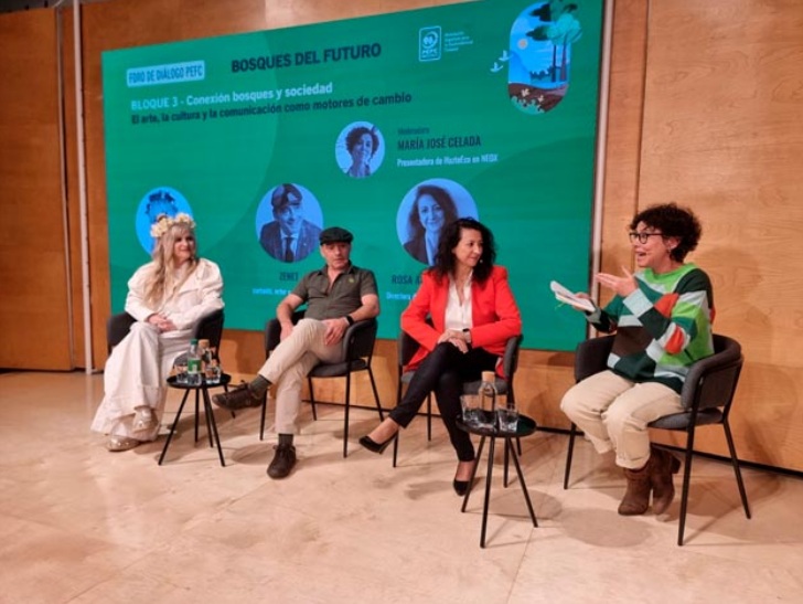 Para finalizar, el Bloque 3 “Conexión bosques y sociedad. El arte, la cultura y la comunicación como motores de cambio” lo formaron María Lafuente, diseñadora y embajadora de la campaña internacional de PEFC “Fashions Change, Forests Stay”, Zenet, cantante, actor y artista plástico, Rosa Ana Rodríguez, directora de Proyectos de la Escuela de Unidad Editorial y María José Celada, presentadora de HazteEco en NEOX como moderadora. Concluyeron que el arte, la cultura y la comunicación son herramientas poderosas para conectar a la ciudadanía con los bosques y promover un cambio de valores hacia la sostenibilidad.