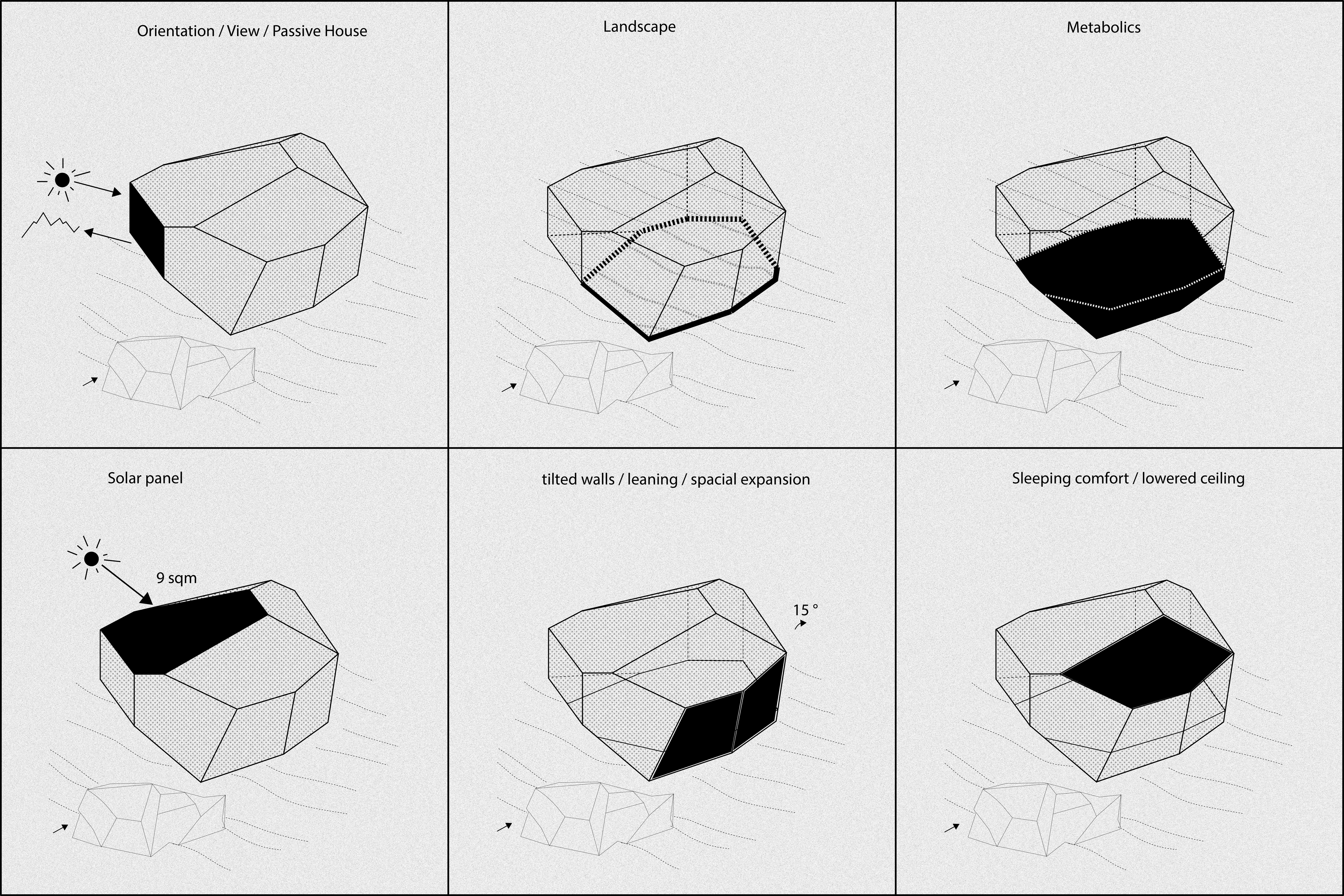La forma escultórica de la cabaña se inspira en el terreno rocoso de los Pirineos. Concebida como un bloque de piedra que parece haber rodado montaña abajo hasta asentarse de manera natural en el lugar, su geometría facetada está compuesta por muros inclinados y un techo en pendiente que responden a las necesidades programáticas, las condiciones climáticas y la exposición solar. La geometría ajusta sutilmente las alturas de los techos y las proporciones de los espacios para acomodar distintos usos dentro de una planta compacta, mientras que las aberturas cuidadosamente ubicadas enmarcan vistas de las montañas circundantes y permiten la ventilación cruzada. Las contraventanas de madera operables garantizan completa oscuridad por la noche, evitando la contaminación lumínica y apoyando las actividades astronómicas del sitio.