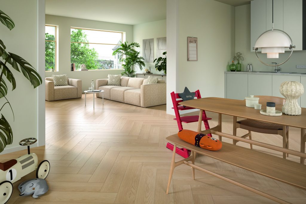 7. Diseños Geométricos: También serán tendencia los patrones como el damero, combinando parquet con otros materiales para lograr un look más sofisticado. La gama Espiga 8/32 Roble Baronia Arena EL 2133, de la nueva colección Egger Pro, ofrece suelos laminados de alta calidad que combinan diseño moderno y funcionalidad. Como parte de la colección Egger Pro, está fabricada a partir de madera como materia prima renovable, brindando una opción sostenible sin comprometer la durabilidad y la estética.