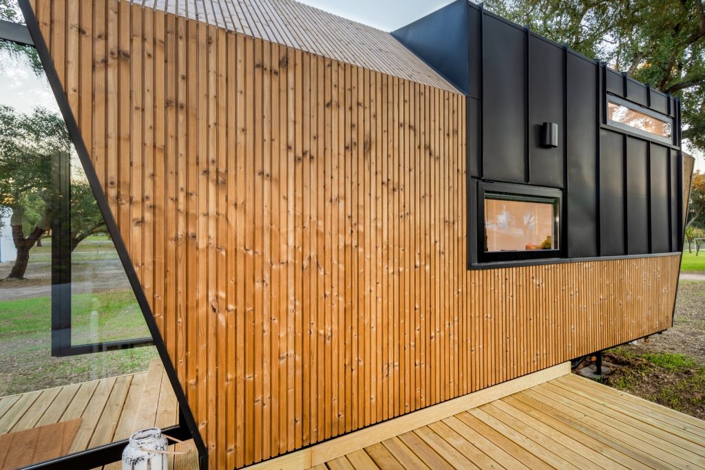 Esta original ‘tiny house’, construida con materiales ecológicos y renovables, está revestida con los paneles de la marca de madera finlandesa Lunawood Thermowood, que Gabarró distribuye en exclusiva en España, lo que les otorga un aspecto natural y contemporáneo además de ser totalmente sostenibles.
