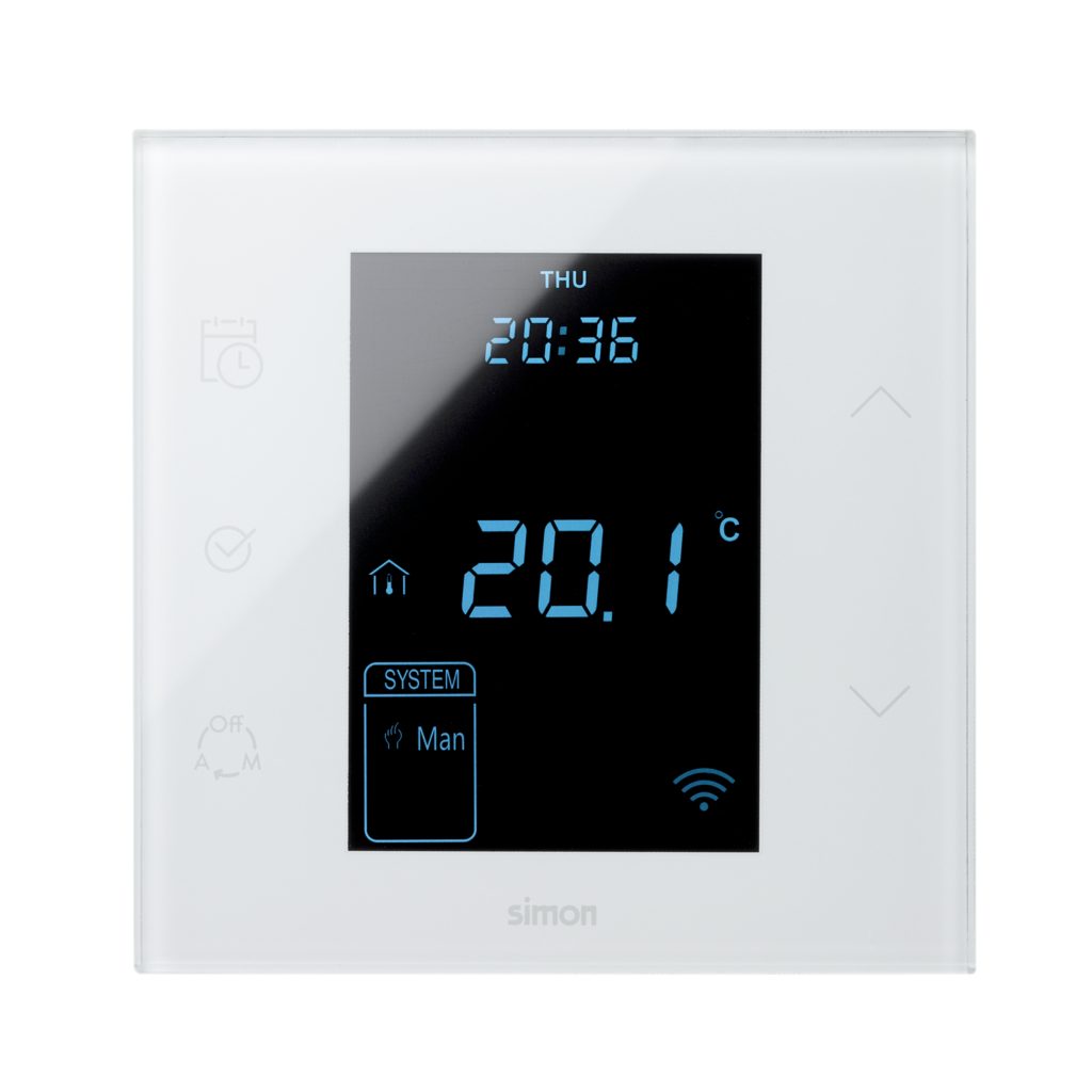 El termostato Simon 100, primera serie conectiva de la compañía, destaca por su simplicidad y precisión. Este mecanismo, con interruptores pulsantes de alta sensibilidad, facilita la regulación precisa de la temperatura. Su diseño minimalista y elegante, disponible en acabados blanco brillante y negro mate, se adapta a cualquier espacio.